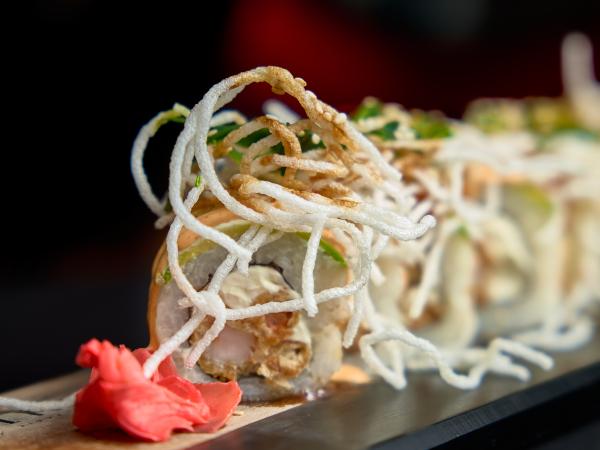 Rollo relleno de queso crema y camarón empanizado, cubierto de aguacate, coronado con cabello de ángel frito e hiyashi wakame, bañado en salsa anguila y spicy mayo con topping de ajonjolí blanco.