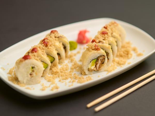 Rollo relleno de queso crema, aguacate y pollo empanizado rebosado en salsa anguila, forrado con una capa fina de queso mozzarella derretido al soplete, acompañado de un toque picante y crocante como topping.